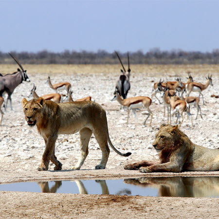 One of the largest game reserves in Africa. Significant to it is the Etosha Pan, the area that makes Etosha game viewing experience unique. 114 Mammals species are found, several are rare and endangered e.g. rhino, cheetah and black-faced impala.